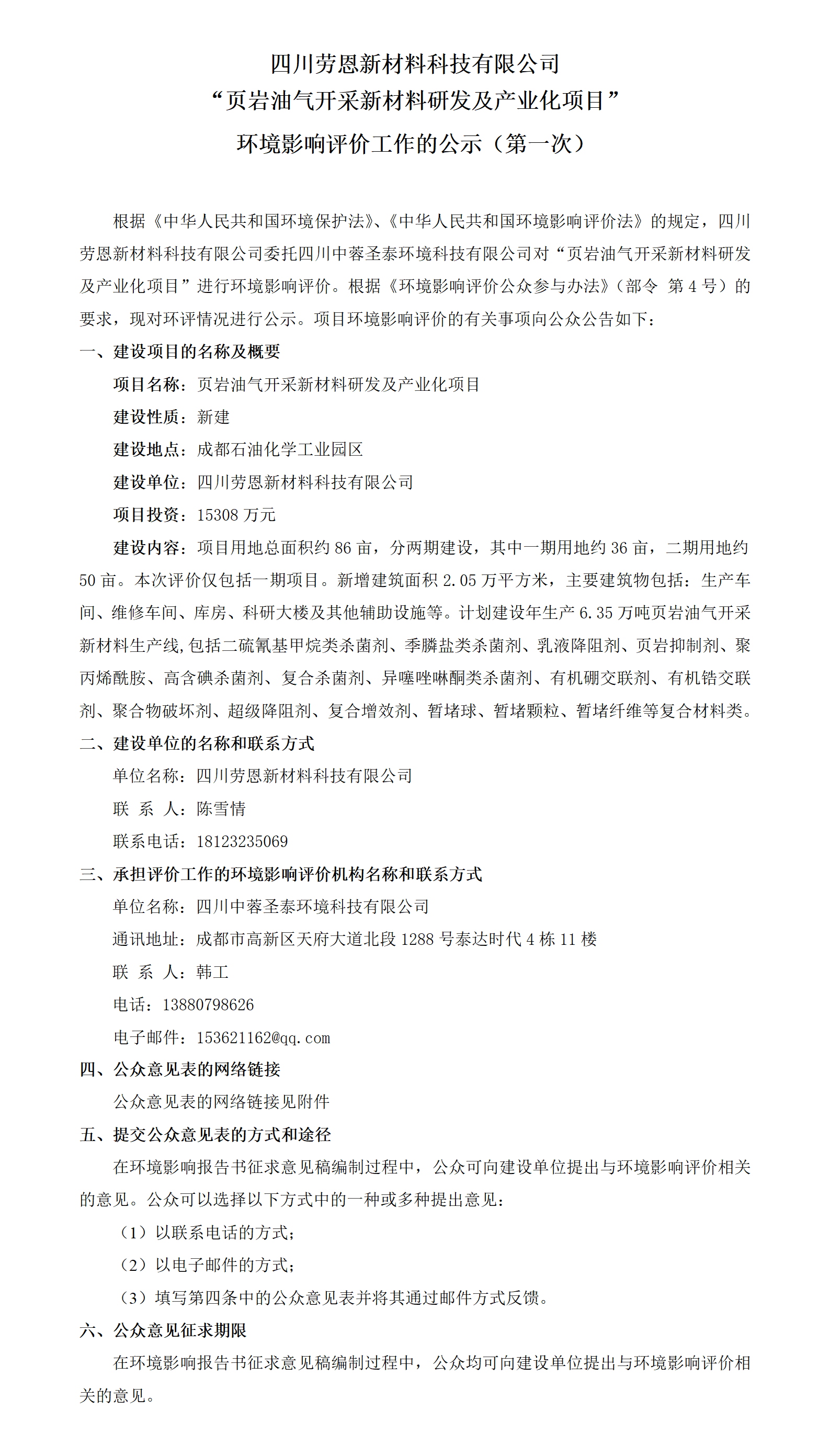 四川劳恩新材料科技有限公司 “页岩油气开采新材料研发及产业化项目” 环境影响评价工作的公示(第一次)